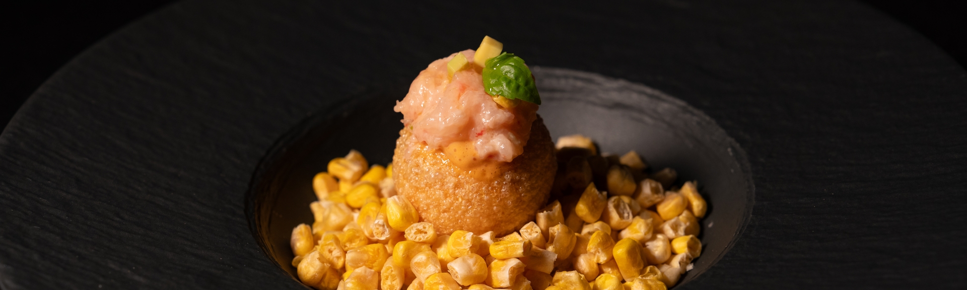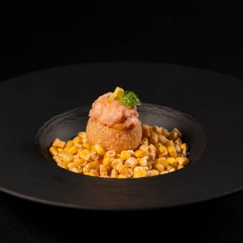 Pani puri with red prawn tartare and cocktail sauce