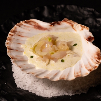 Scallop with smooth velouté sauce flavoured with lemon and pickled fennel